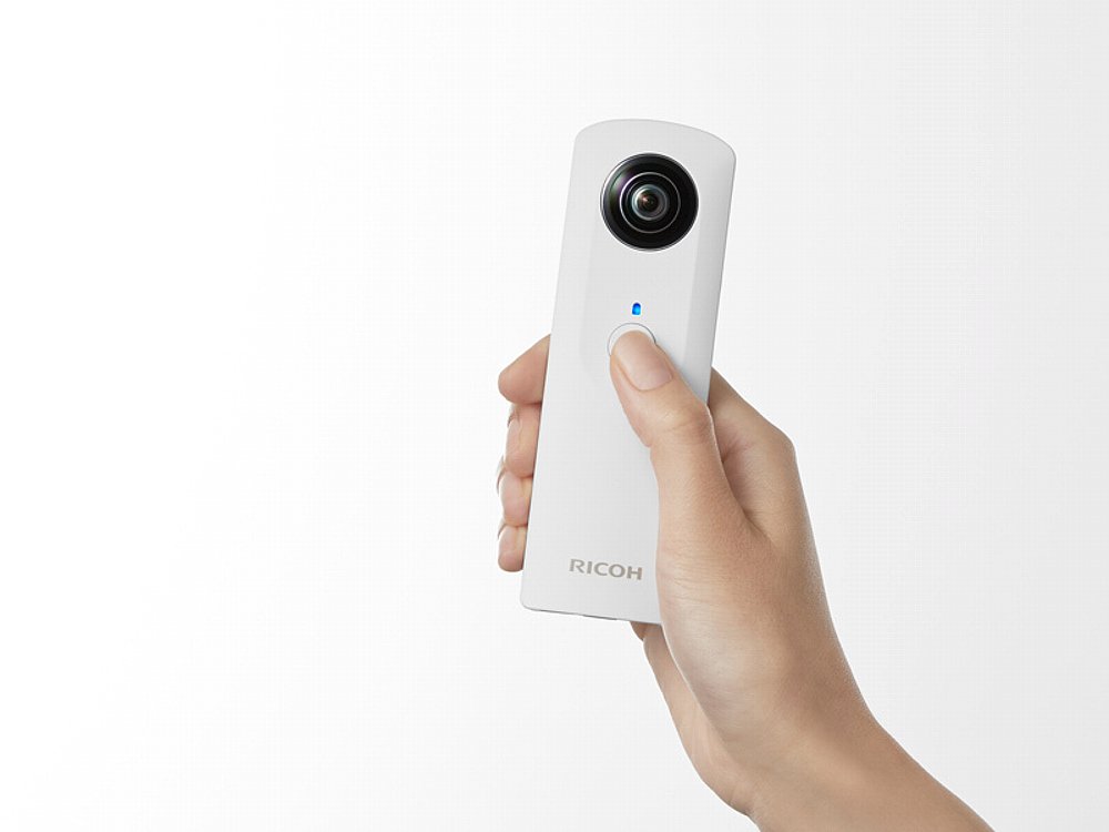 Die Theta nimmt ausschließlich vollsphärische Panorama-Fotos auf. Dabei befindet sich die Kamera im Zentrum einer gedachten Kugel, das Bild wird dann gewissermaßen auf die Innenfläche der Kugelschale projiziert. Und dazu benötigt die Theta eben zwei Objektive, die jeweils einen Bildwinkel von 180 Grad erfassen. Eines schaut dabei wie gewohnt nach vorne, das andere ist dem Fotografen zugewandt.