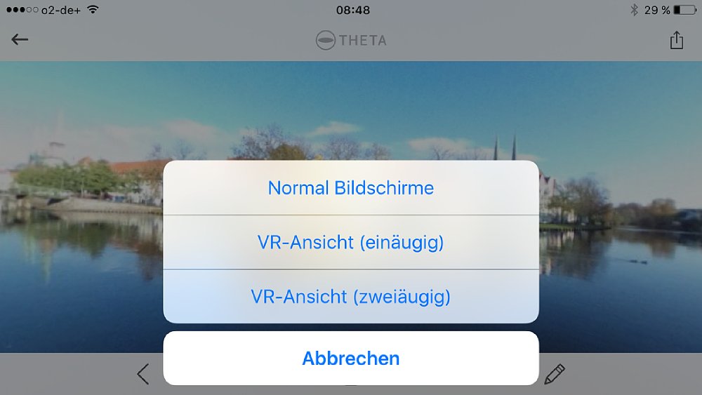 Beim Betrachten der Fotos kannst du dann wählen, ob du sie "normal" anschaust, d. h. du verschiebst den Bildschirmausschnitt mit dem Finger auf dem Touch-Bildschirm, oder ob du das Foto in VR-Ansicht anschauen willst. Dann bewegst du dich in der Szene, indem du das Smart Device schwenkst oder nach oben und unten neigst, interaktiv siehst du dabei immer automatisch den passenden Ausschnitt. Mit einem iOS-Device hast du sogar die Wahl zwischen "Einäugigem" und "Zweiäugigem" VR-Modus. Auf Android gibt es nur den zweiäugigen Modus. Da wird dann der Bildschirm unterteilt, do dass du das mit einer VR-Brille oder einem Google-Cardboard-Smartphone-Aufsatz verwenden und dann wirklich in die Szene abtauchen kannst. Das geht bei Video leider nicht, dort hast du nur den normalen Wiedergabemodus.