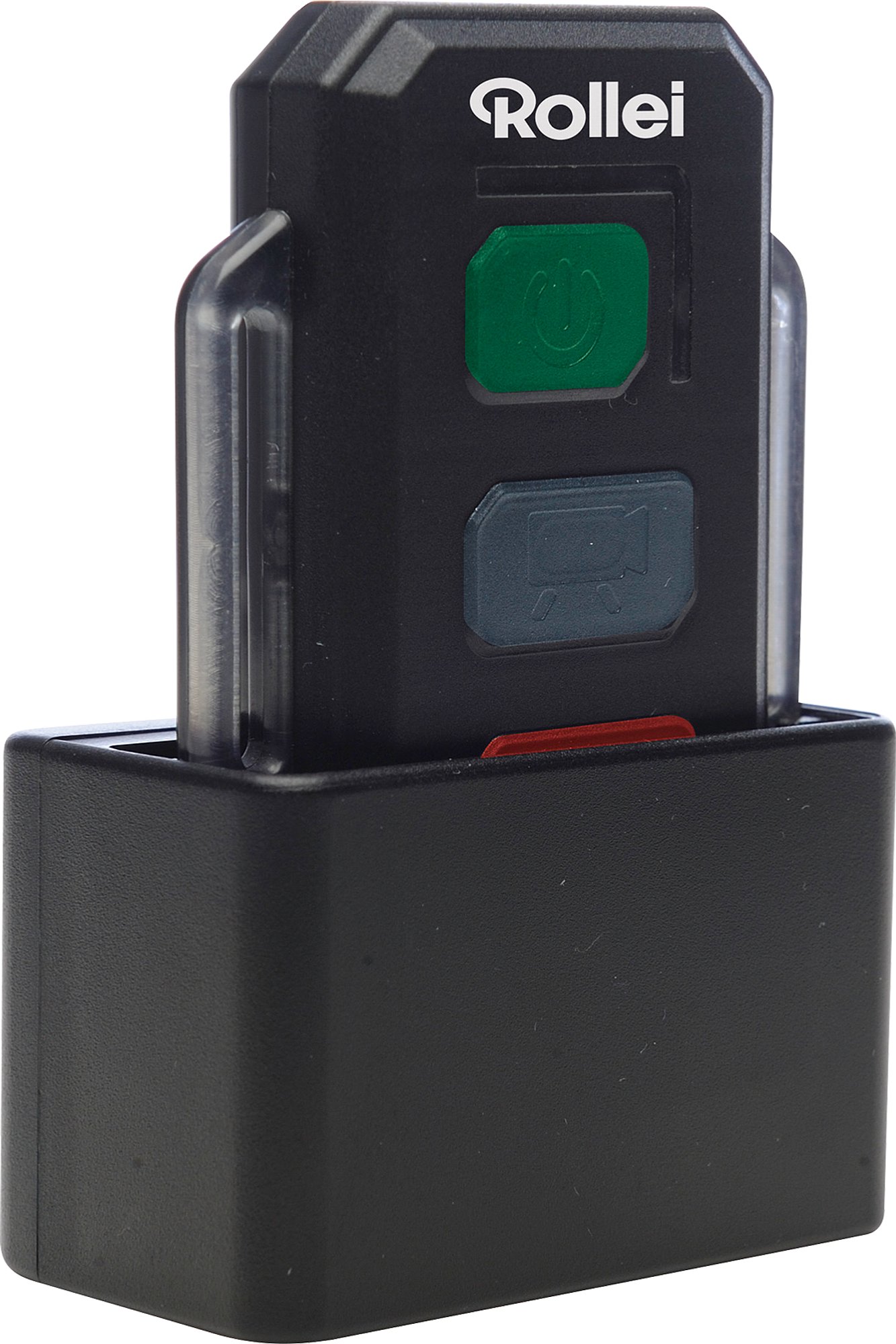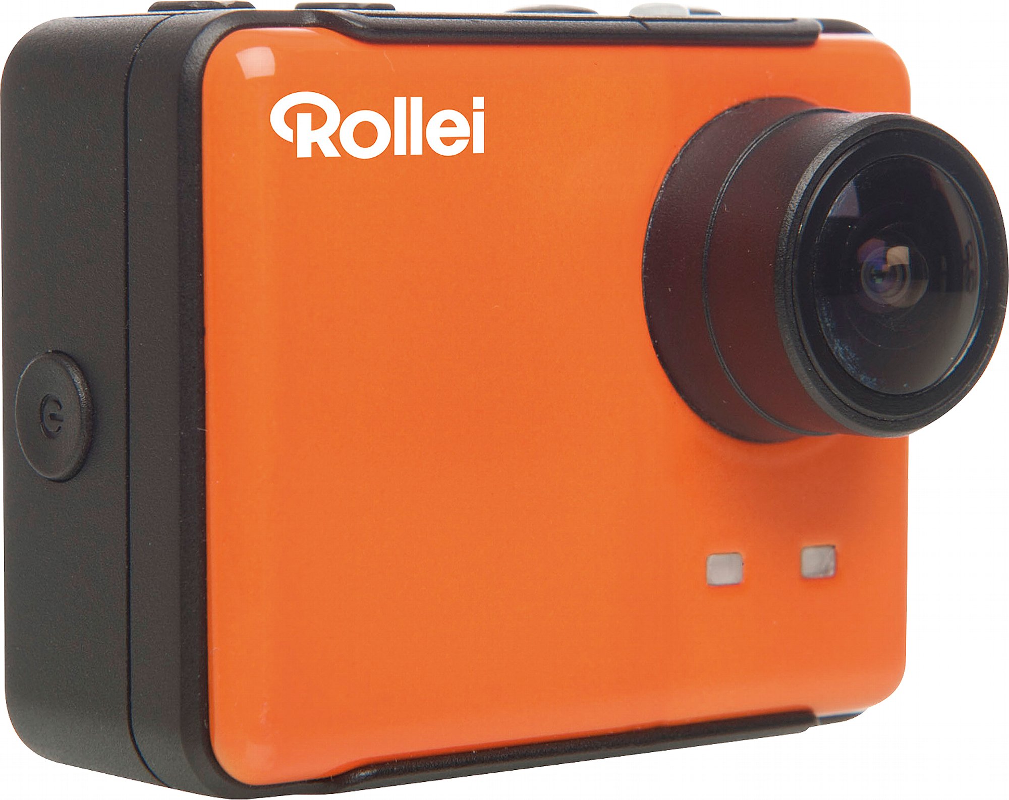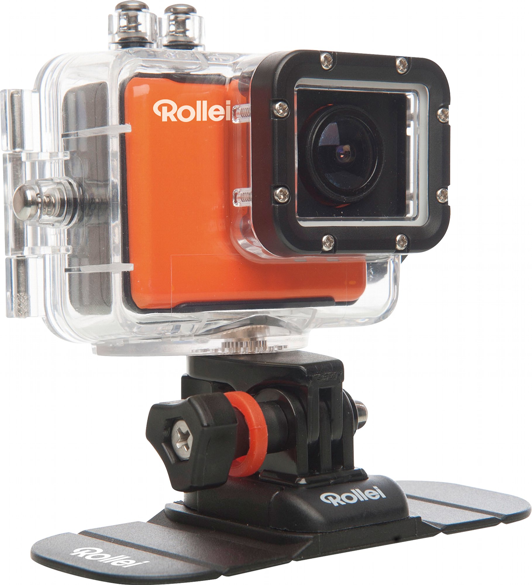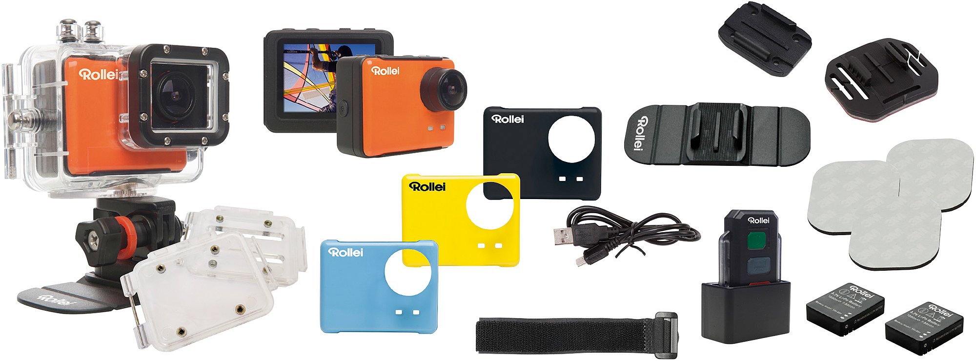 Die Kamera wird in einer ansprechenden Verpackung geliefert. Auf einem würfelförmigen Karton ist eine transparente Kunststoffkuppel angebracht, in der man die auf einer Halterung montierte Actioncam gut sehen kann. GoPro hat dieses aufwändige Verpackungsdesign vor Jahren entwickelt und einige andere Action-Cam-Hersteller haben das übernommen. Vorinstalliert ist ein orangefarbenes Frontcover, das dem Gerät ein modernes und freundliches Aussehen gibt. Das Auspacken ist allerdings nicht ganz so einfach – zumindest, wenn man die hübsche Verpackung nicht in Stücke reißen will. Zunächst entfernst du die äußere Hülle des unteren Kartons, um anschließend ein Klebeband abzuklauben, mit dem die Kuppel auf dem Karton befestigt ist. Nun lässt sich der untere Karton wie eine Schublade öffnen, in dem schon in der Standard-Edition eine Menge Zubehör zu finden ist (Rollei bietet noch andere Ausstattungsvarianten an, die jeweils auf spezielle Anforderungen ausgelegt sind).