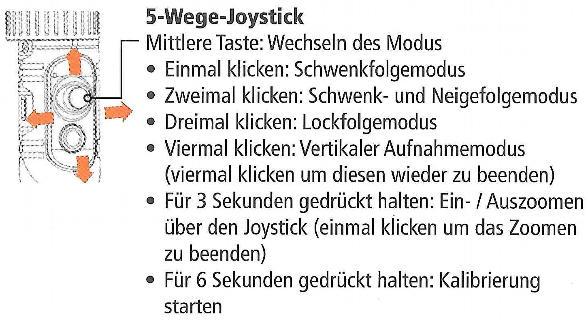 Die Ausrichtung der Smartphone-Kamera über den Joystick in die vier Richtungen kann sehr feinfühlig erfolgen. "Kann" deshalb, weil es eine sehr gute Feinmotorik im Daumen voraussetzt, den Kopf durch minimales Bewegen des Joysticks aus seiner Mittelstellung sehr langsam zu schwenken. Bewegst du den kleinen Joystick etwas zu weit aus der Mittelstellung, dann ändert der Kopf sehr schnell seine Richtung. Es erfordert also einiges Feingefühl, die Richtung während des Videodrehs zu ändern. Aber wenn du den für deine Zwecke passenden Modus wählst, brauchst du den Joystick während des Drehs vermutlich gar nicht zu bedienen. Wenn du beispielsweise den "Schwenk- und Neigefolgemodus" wählst (zweimal Tippen auf den Joystick; Doppelblinken der Funktionstaste), dann folgt das Smartphone sanft jeder Bewegung, die du mit dem Gimbal-Kopf in der Hand ausführst (siehe oben), und du kannst (und solltest) bei Filmen eigentlich den Finger vom Joystick lassen.