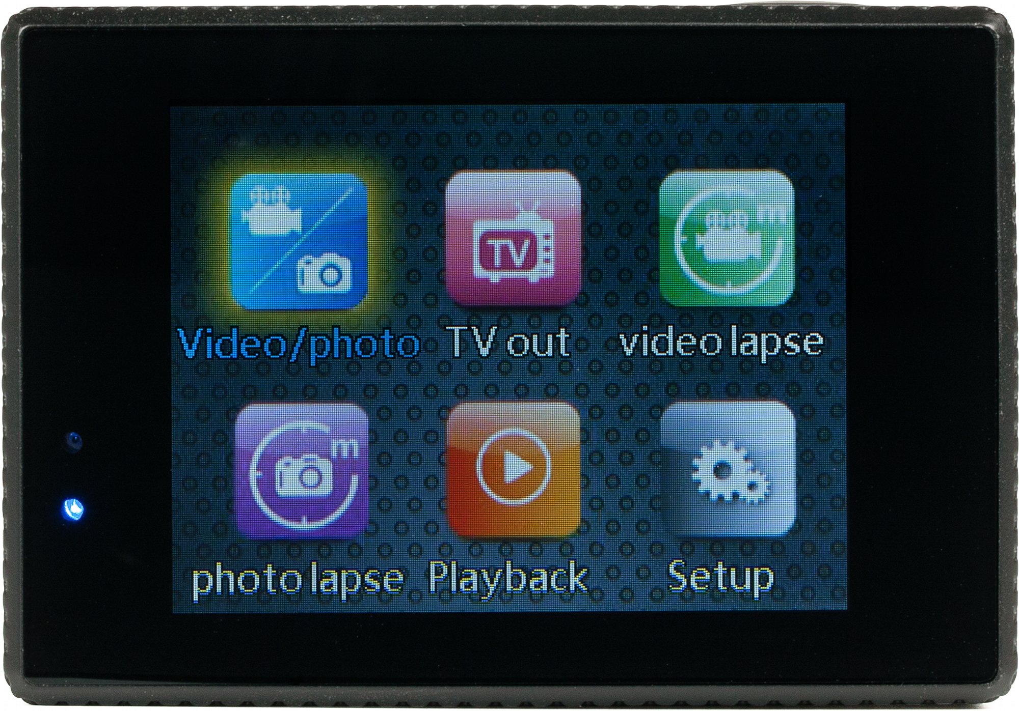 Schaltest du die SJ5000X nun über den vorderseitigen Knopf ein, ertönt eine einfache Glockenspiel-Melodie. Alle anderen Aktionen sind mit „seriösen“ Pieptönen unterlegt. Das Hauptmenü wiederum ist eher verspielt angelegt: Sechs bunte Icons weisen dir den Weg in die Wiedergabe-Galerie, den HDMI-Ausgabe-Modus, die Kamera-Einstellungen, die Video-Lapse-Funktion, den Foto-Lapse-Modus und den normalen Foto-/Video-Sucher. Letzterer Knotenpunkt ist übrigens notwendiger als du denken magst, denn so, wie du durch das Klicken mit der vorderseitigen Mode-Taste in das Menü hineingekommen bist, kommst du dort nicht wieder heraus: Du musst also zwischen den Icons navigieren und gelangst nur über diese in den Aufnahme-Sucher zurück. Der Unterschied zwischen den Menüpunkten Video- und Foto-Lapse besteht darin, dass du in „VideoLapse“ einen beliebig langen gefilmten Zeitraum auf eine vorher festgelegte Länge beschleunigen kannst (1, 2, 5. 30 und 60 Sekunden) und in „FotoLapse“ in festgelegten Abständen (2, 5, 10 oder 20 Sekunden) aufgenommene Bilder mit einer festen Framerate zusammengefügt werden, wodurch die Länge des entstehenden Videos variabel ist. Übrigens fällt beim Wechsel zwischen Aufnahmemodi, beim Kamerastart sowie beim Navigieren durch die Menüs auf, wie flink die Actioncam agiert. Waren die SJ4000 und die SJ5000 (mit anfänglicher Firmware-Version) gerade in diesem Bereich noch arg am Stottern, gerät die SJ5000X überhaupt nicht ins Schwitzen.