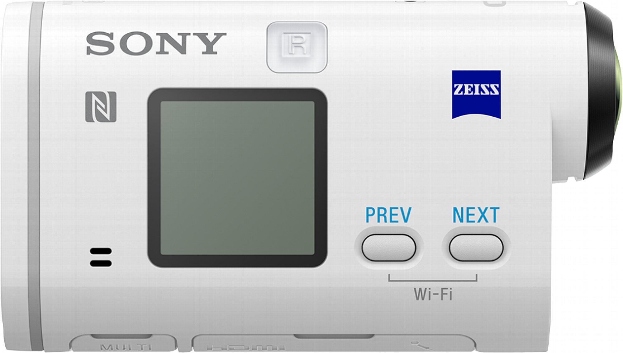 Die Bedienung der Kamera erfolgt über drei Tasten: [Prev] und [Next] an der Seite und [Rec/Enter] hinten in der Akkufach-Klappe (letztere kann mechanisch gegen versehentliches Betätigen gesperrt werden). Optische Rückmeldung liefert ein kleines Schwarzweiß-LC-Display. Dessen fünfstelliges 14-Segment-Taschenrechnerdisplay liefert vieldeutige Aussagen wie "PwOFF", "USBPw", "A.OFF", "WT-FT" (was WiFi heißen soll) oder "V.SYS" und "PRO" (worunter sich die Umschaltung in den XAVC S Videomodus verbirgt). Diese Spar-Ausstattung macht die Bedienung natürlich nicht komfortabel. Aus irgendwelchen Gründen bleibt Sony aber diesem Anzeige- und Bedienkonzept schon seit mehreren Jahren treu, statt auf ein normales Dot-Matrix-Display mit klar lesbaren Buchstaben zu setzen. Zum Glück sind die Einstellmöglichkeiten nicht unnötig überfrachtet. Man kommt deshalb doch irgendwie ganz gut klar. Ebenfalls treu bleibt Sony dem Bedienkonzept, dass die Kamera nachdem du eine Einstellung im Menü verändert hast, wieder komplett aus dem Menü rausspringt. Viele Änderungen (z. B. die Kamera-Grundeinstellungen) vorzunehmen, gerät so zu einer langwierigen, wilden Tastendrück-Orgie, weil du dich immer von vorn durchs gesamte Menü klicken musst.