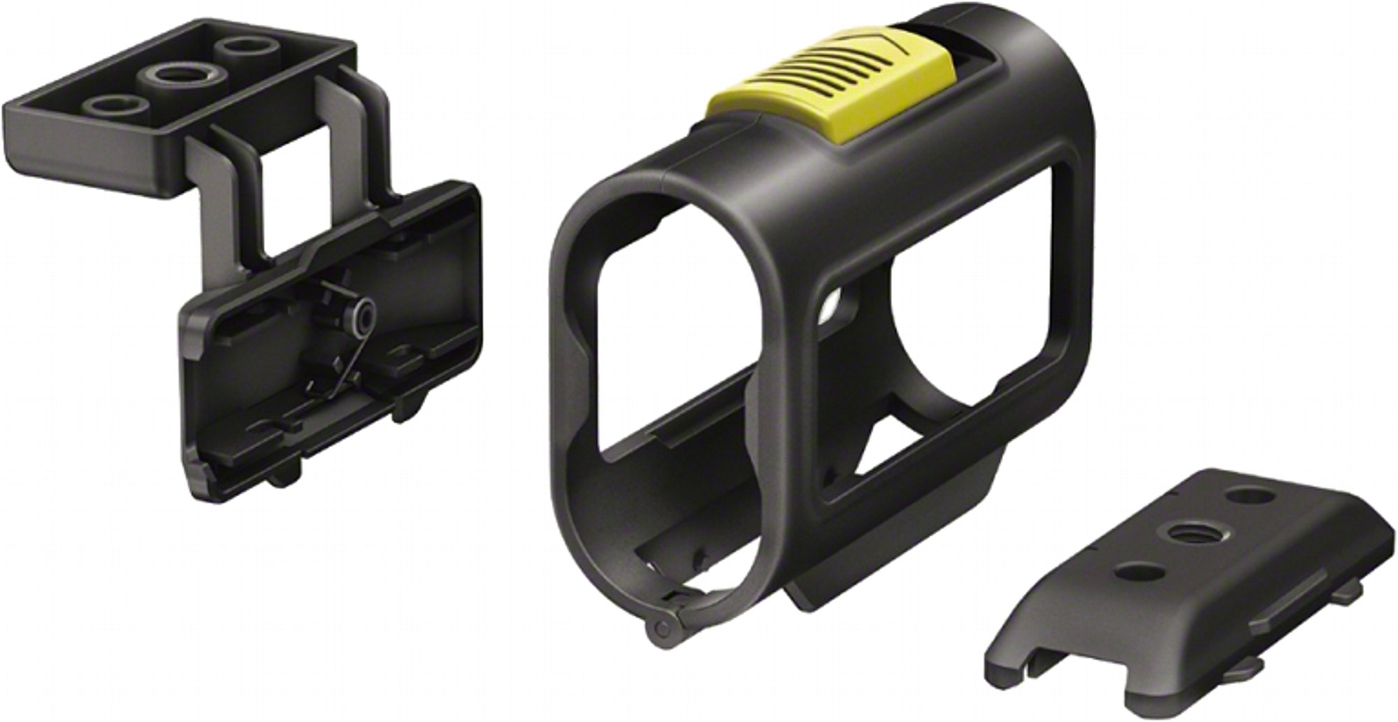 - Den AKA-SF1 Skelettrahmen möchte ich kurz erwähnen, denn den braucht man eigentlich, wenn man die 3,5mm-Mikrofonbuchse der HDR-AS200V nutzen möchte. Der Stativadapter verdeckt nämlich den Zugang zu der Buchse und auch der Handgriff mit LC-Display tut das (bei letzterem würde eventuell eine Bohrmaschine und ein 10mm-Bohrer in Verbindung mit ein wenig Heimwerker-Geschick helfen). Die Fertig-Lösung, wenn alle Buchsen unten zugänglich sein sollen, heißt AKA-SF1 Skelettrahmen (auch ursprünglich für die älteren schwarzen Sony Actioncams entwickelt) und kostet 29 Euro. Mit dem wird die Kamera seitlich befestigt und unten, dort wo die Schnittstellen sitzen, bleibt alles frei.