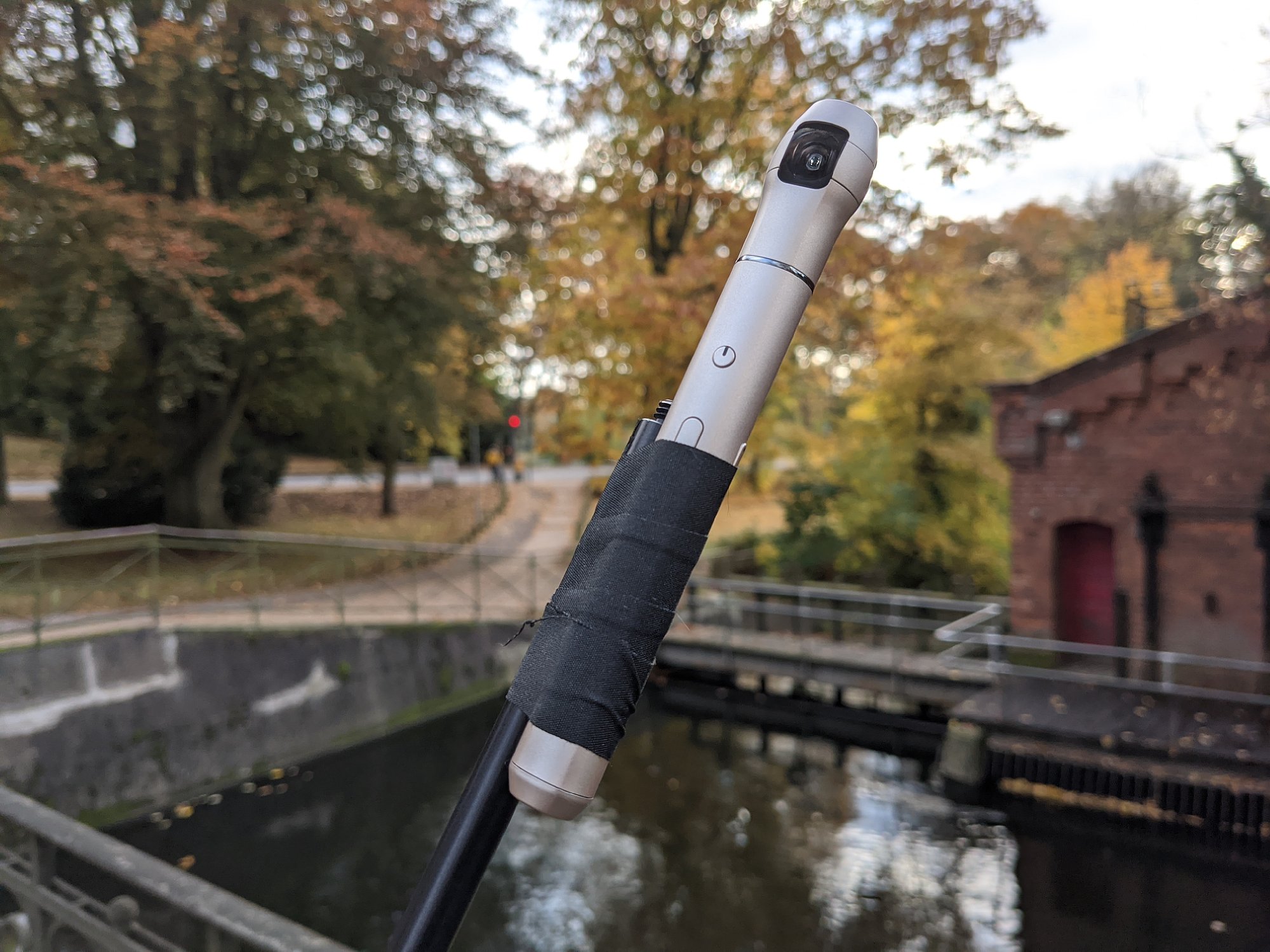 Da mich persönlich 720-Pixel-Bubble-oder-Herzchen-Videos eher weniger interessieren, habe ich mal geschaut, was die Vecnos IQUI als ganz normale Panorama-Kamera eigentlich effektiv leistet. Wir haben auf digitalEyes.de in letzter Zeit unser Standard-Wassermühlen-Motiv, das fast immer funktioniert, wenn es nicht gerade regnet. Und da musste die Vecnos IQUI ebenfalls ran. Auch ohne Stativgewinde, etwas Gewebe-Klebeband funktioniert ebenfalls. Statt unseres 5-Meter-Manfrotto-Booms habe ich "nur" den 3-Meter-Insta360-Selfie-Stick verwendet. Mein Sohn hat die "Making-of-Fotos" gemacht. Das Ergebnis seht ihr in unserem Panorama-Viewer (ein zweites Foto zeigt eine Indoor-Aufnahme).