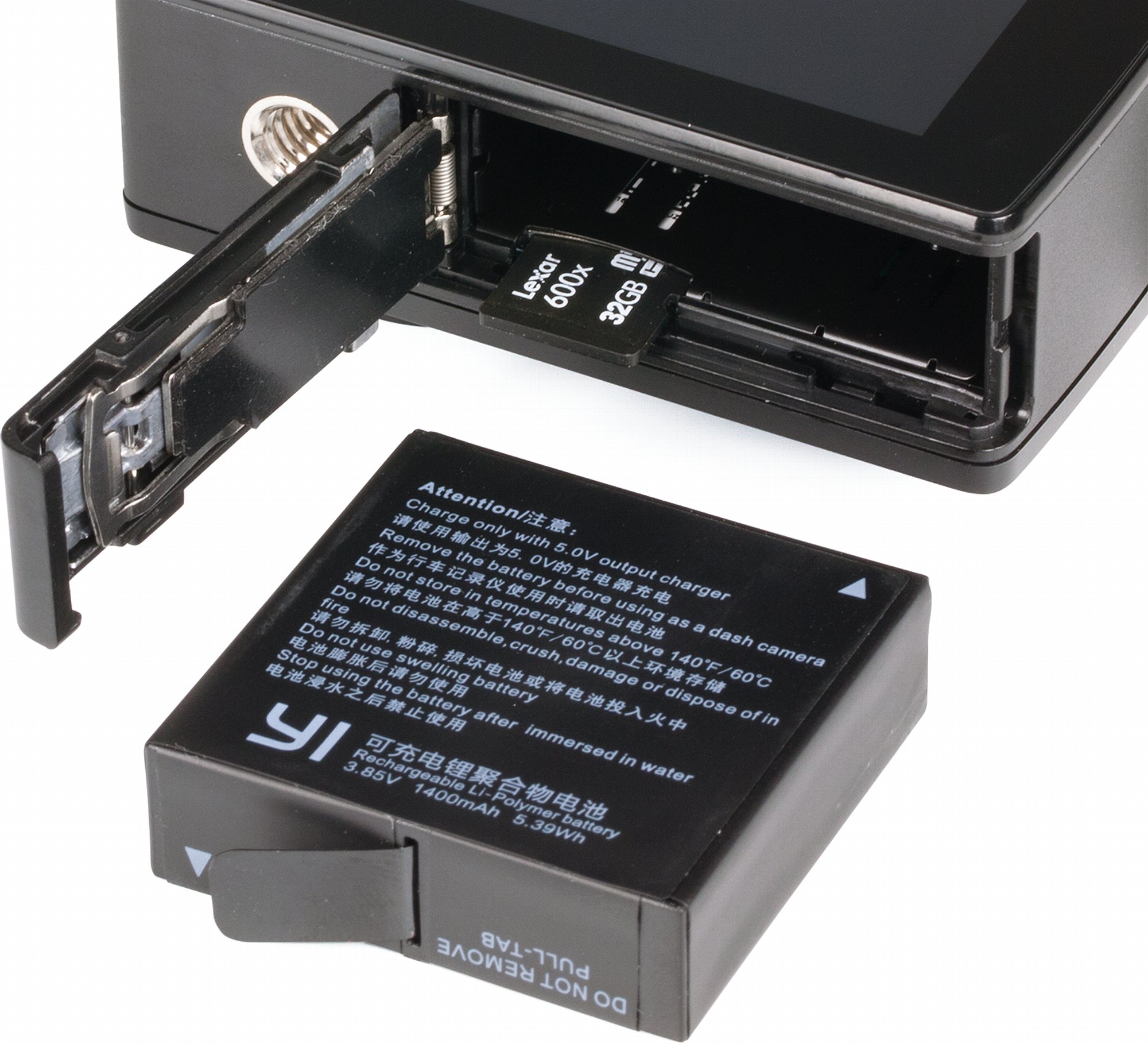 Relevant für Leute, die sich die Actioncam unter ihren Multikopter hängen möchten: Trotz eingebautem Touchscreen-Monitor ist die Yi 4K Action Camera in etwa so klein und leicht (89 Gramm inkl. Akku) wie eine GoPro Hero. Sie hat direkt ein Metall-Stativgewinde eingebaut, das schön mittig unter dem Objektiv sitzt. Aufgrund ihrer etwas anderen Abmessungen und ihrer leicht gewölbten seitlichen Gehäusewände passt sie allerdings natürlich in keinen Gimbal-Kopf, der für GoPro-Kameras entwickelt wurde. Rein theoretisch kann die Kamera sogar ein Live-Videosignal liefern. Dieses soll an die einzige Buchse, die USB-Buchse, angeschlossen werden. Eine entsprechende Umschaltung im Menü gibt es, einen entsprechenden Hinweis in den FAQs auf der Herstellerwebsite ebenfalls. Allerdings konnten wir das dort angekündigte Anschlusskabel nirgendwo finden, nicht einmal auf der Herstellerseite. Ohne ein solches Kabel bleibt der Videoausgang graue Theorie.