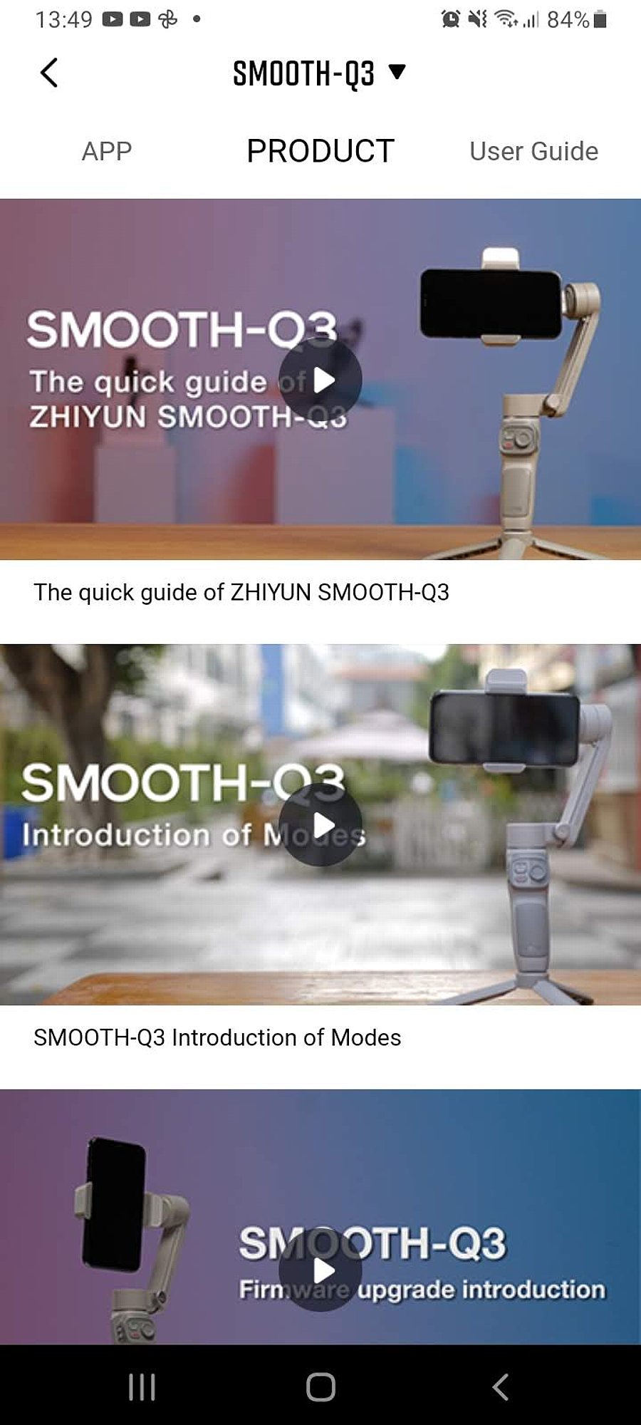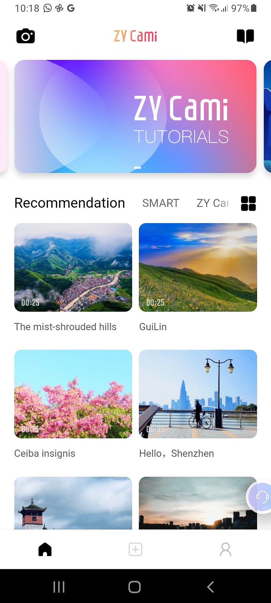 Beim Öffnen der App präsentiert diese erstmal eine Videogalerie von anderen Zhiyun Gimbal Anwendern oder es sind perfekte Anwendungsbeispiele. Möchte man selbst Aufnahmen tätigen, dann gibt es keine eigene Schaltfläche, sondern nur ein kleines Icon.
