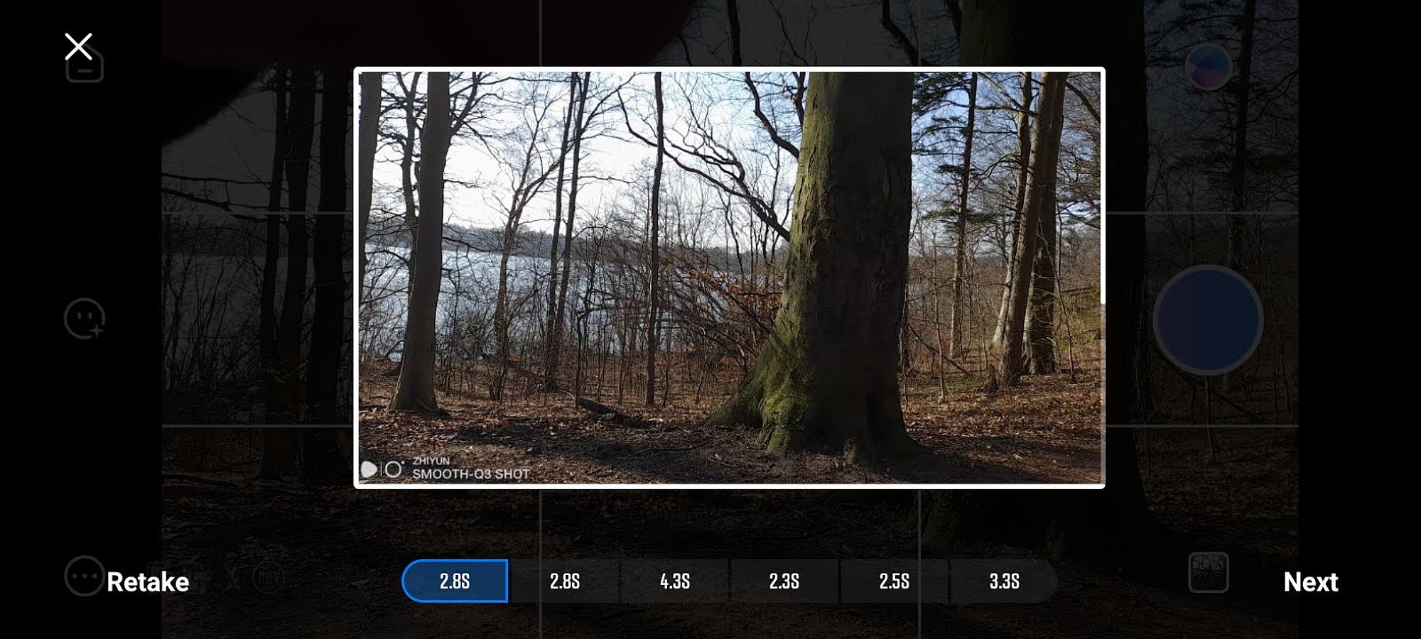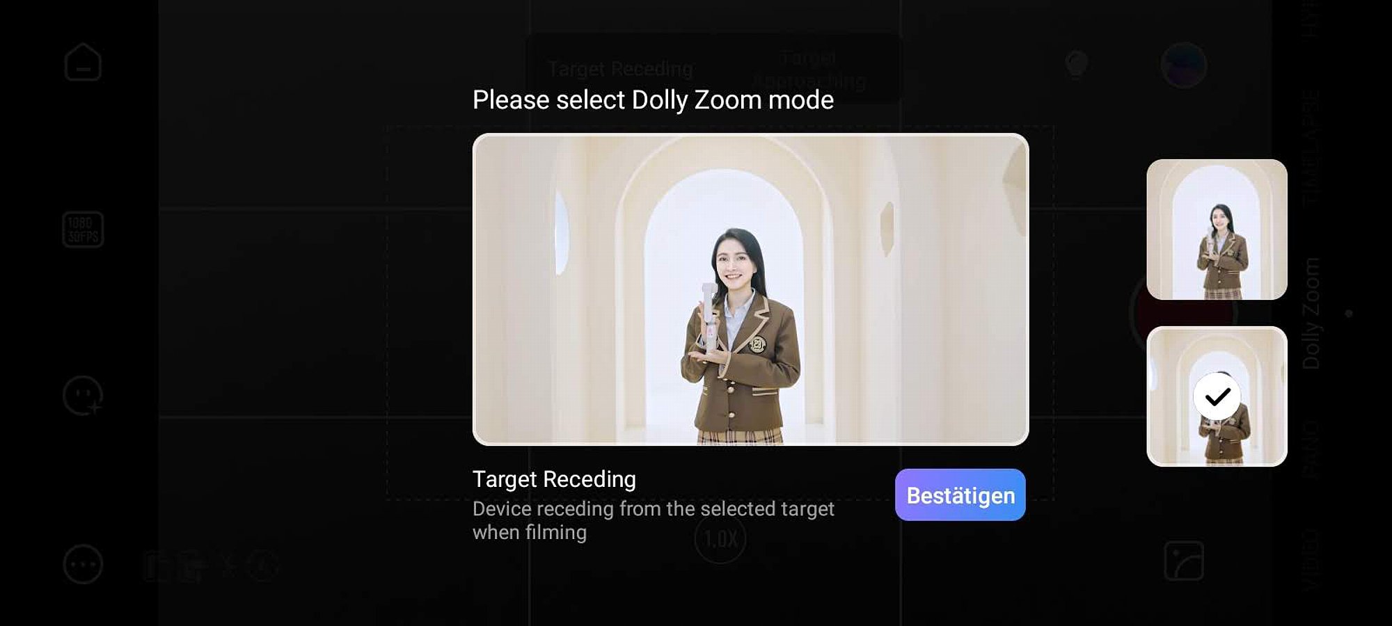 Die Funktionen werden auf einer schmalen Leiste unter dem Vorschaubild verschoben. Navigiert man dabei auf "Smart", so plärrt ein unglaublich nervtötender Jingle des ersten Vorschauvideos aus dem Lautsprecher. Allerdings ist die Smart-Funktion wirklich ziemlich smart. Es handelt sich dabei um insgesamt 17 vorinstallierte Aufnahme-Templates. Mit diesen können wiederkehrende Aufnahmearten und Gimbal-Bewegungsmuster bei der Aufnahme angewendet werden. Dazu wird immer eine kleine Vorschau eingeblendet, wie sich was sich im nächsten Take abspielen wird. Sind alle Takes im Kasten rendert die App das fertige Video und das kann dann in die weite Welt des Internets übertragen werden. Schöne Idee für wiederkehrende Aufnahmen oder einen kreativen Tiefpunkt. Zusätzlich können weitere dieser Templates heruntergeladen werden und andere sind hinter der Prime-Paywall versteckt.