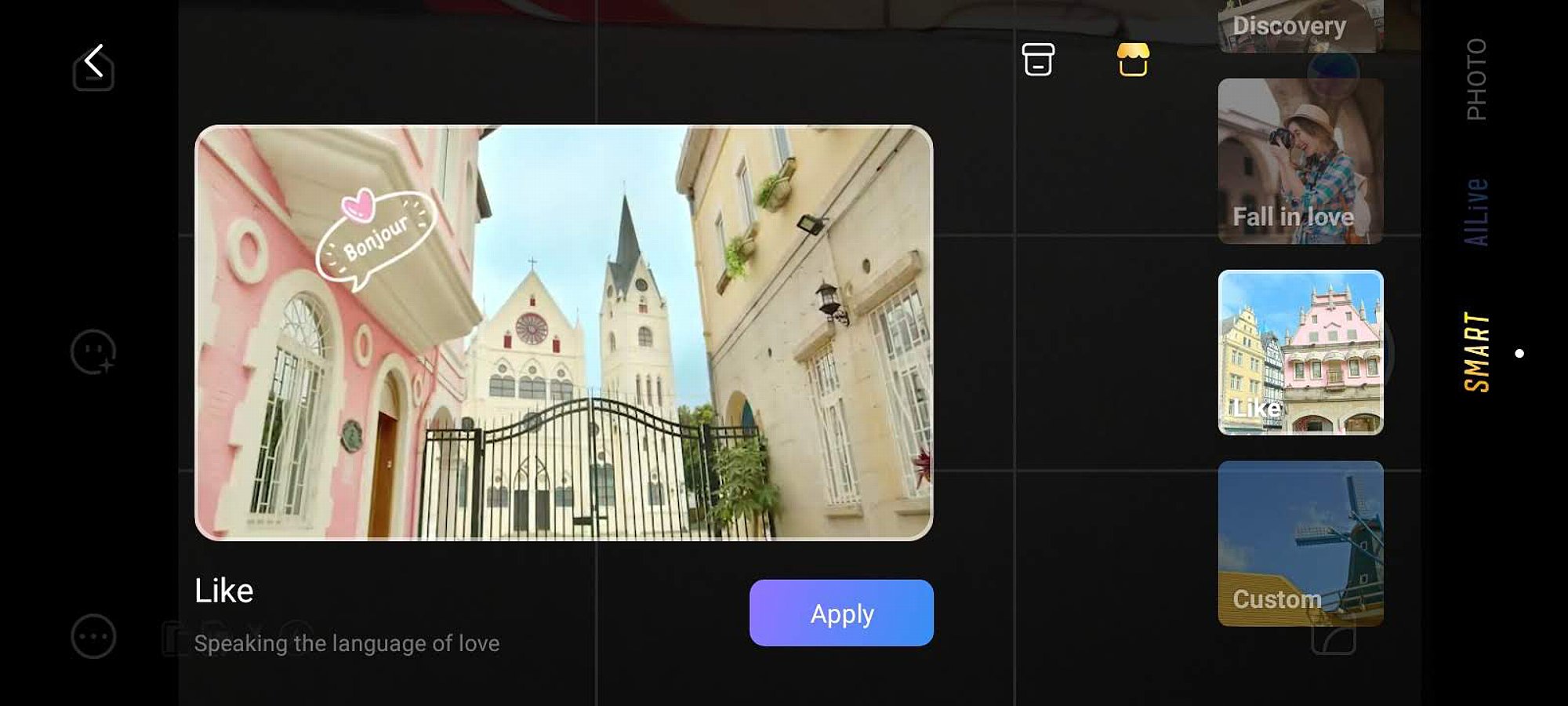 Zudem können Bearbeitungs-"Templates" heruntergeladen werden. Diese Templates sind ähnlich mit den Smart-Templates bei der Aufnahme. Der Unterschied ist, dass diese Templates mit bereits gemachten Videos und Fotos bestückt werden. Die hinzugefügten Videos oder Fotos können dann mit Filtern versehen werden und dann werden sie als zusammenhängendes Video gerendert. Dabei ist anzumerken, dass die Dauer der einzelnen Clips von den Templates vorgegeben werden. Lange Videos werden also einfach abgeschnitten. Von den Bearbeitungs-Templates stehen dem Fotografen allerdings nur ein paar kostenlos zur Verfügung. Weitere dieser Templates sind hinter dem "Prime" Angebot (Paywall) verborgen.