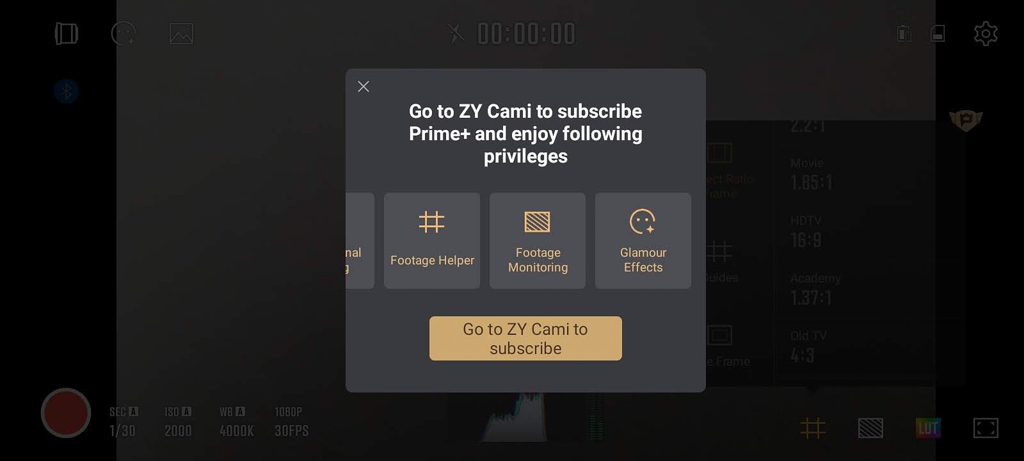 Wer ausführliche fotografische Funktionen möchte, der ist bei der ZY Cami App an der falschen Adresse, dazu muss man sich die "Profi App" herunterladen. Diese findet man entweder unter StaCam in den App Stores oder in einem kleinen Untermenü im Kameramodus. Die App ist deutlich umfangreicher in Ihrem Funktionsumfang, so stehen beispielsweise komplexere Einstellungen für die Videofunktion zur Verfügung. Moderne Gradationskurven (LUT) können auch heruntergeladen und eingesetzt werden. Einige davon sind aber, so wie auch die Glamoureffekte hinter der "Prime" Paywall verborgen. Ebenfalls hinter der Paywall ist die Zebrafunktion, Fokus-Peaking und fortgeschrittene Einstellungen bestens vor dem Zugriff des Videografen geschützt. Die Profi-App ist also ziemlich witzlos ohne Prime Abo.